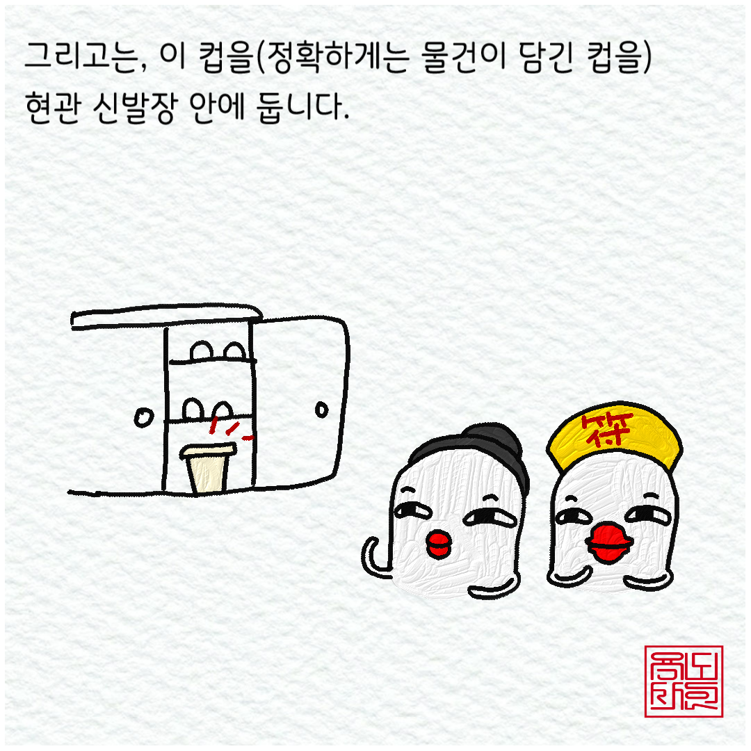 이렇게 잘 섞은 내용물이 들어간 컵을, 현관 신발장 안에 넣어둔다.
