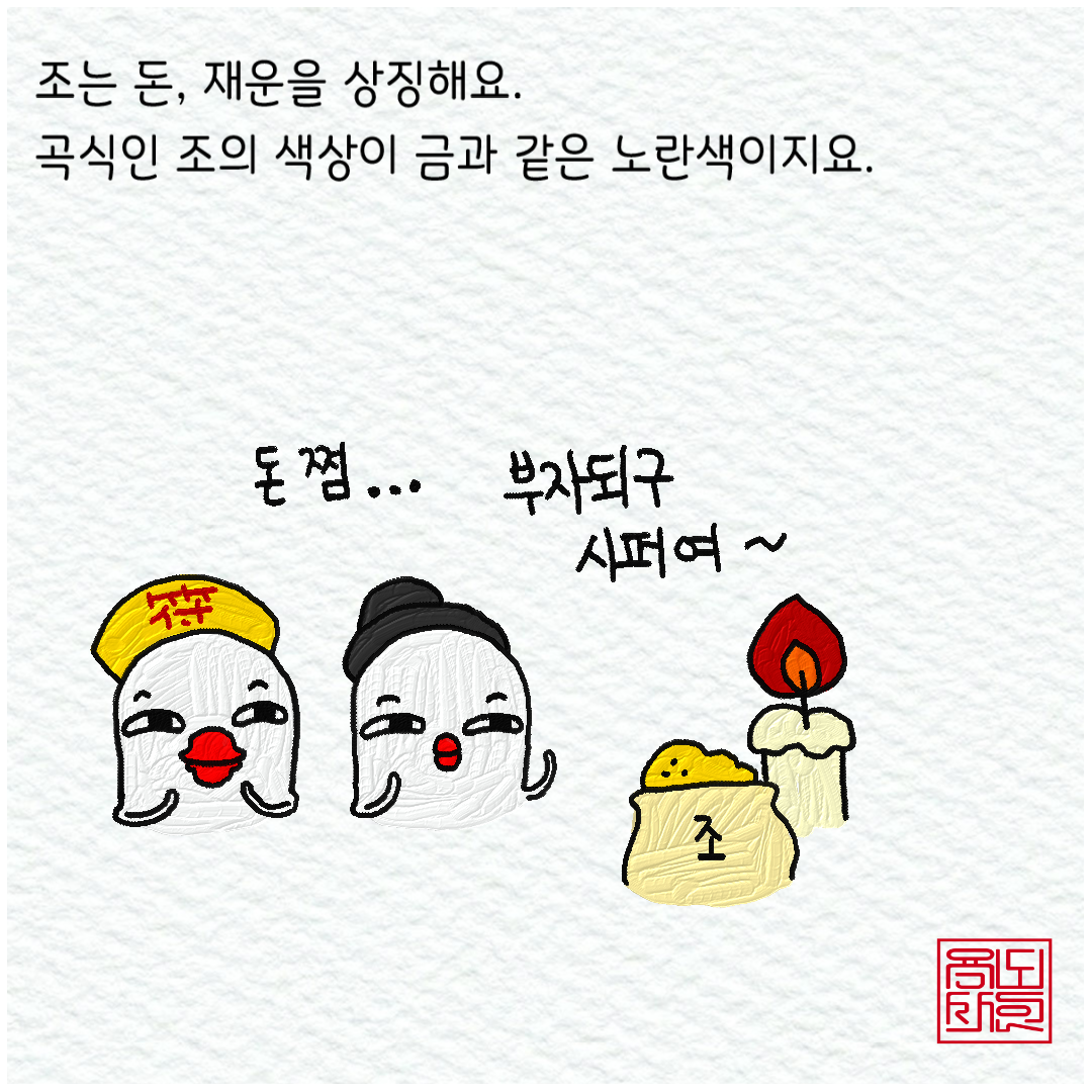 동양에서 가장 귀하게 여기는 보물은 "금"이다. 특히 화폐를 대신할 정도로 오랫동안 사랑을 받아왔다는 점에서 보면, 조의 노란색이 금의 색상과 비슷하니 짐작하실 것이다.