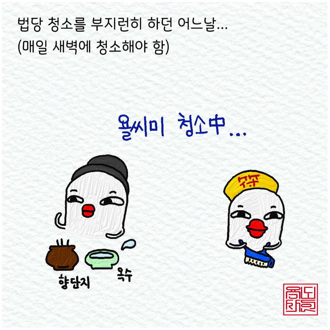 참고로 법당은 매일 아침 일찍 청소를 한다. 깨끗하게 청소를 하고 아침 기도를 드리고, 향을 갈고 옥수(신들이 드실 물)를 새로 떠 놓는 것으로 하루를 시작하는.