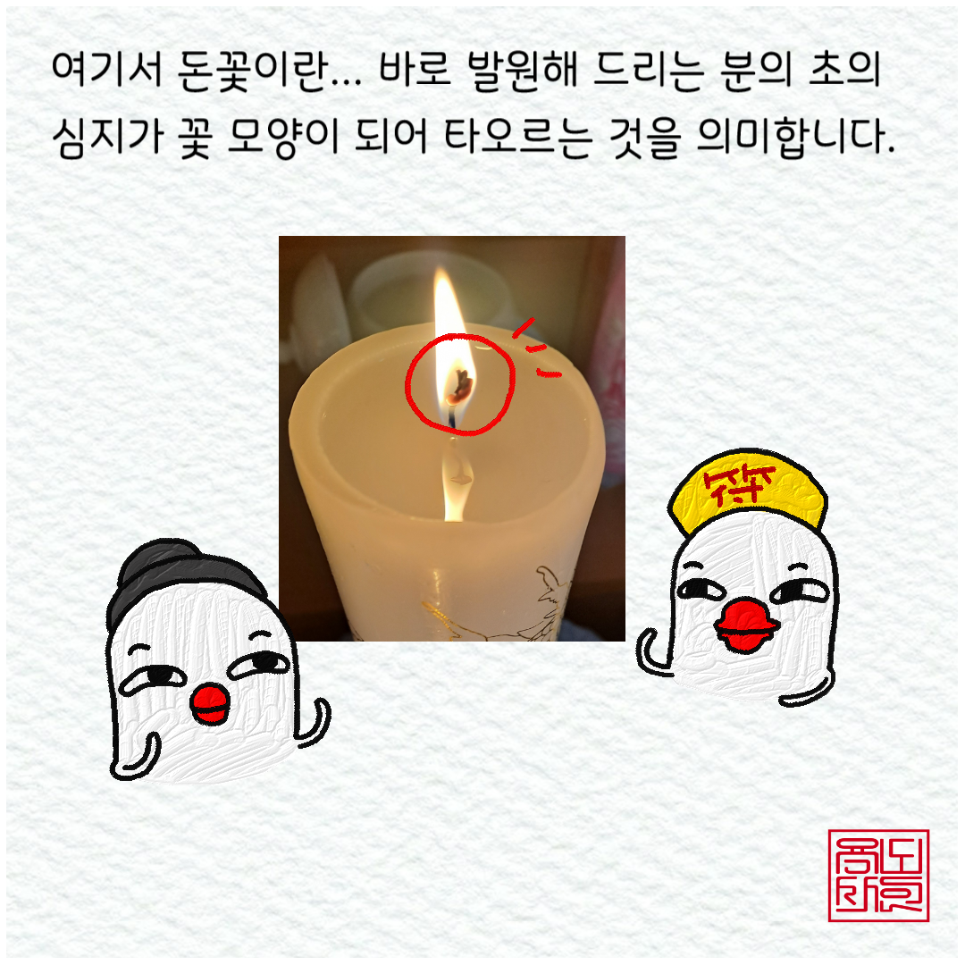 바로 초의 심지가 꽃의 모양이 되어 타오르는 것을 말한다. 이 때 심지가 타는 모양이 마치 빨간 꽃의 모양과 같다고 하여 "돈꽃"이라고 부른다.
