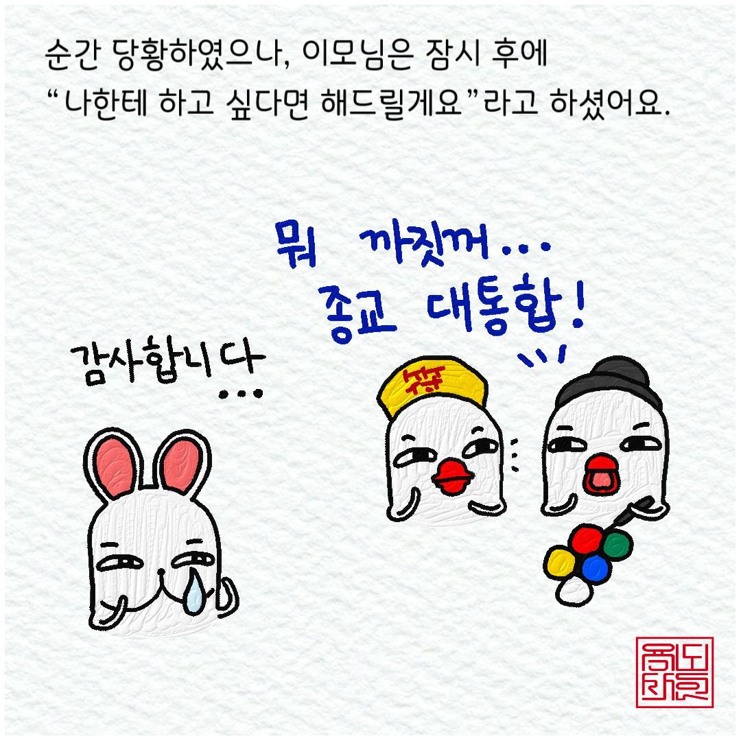 "그려, 뭐 별 거 있어. 종교 대통합인게야. 나라도 괜찮다면 내가 상문 확실하게 없애 드릴게요."